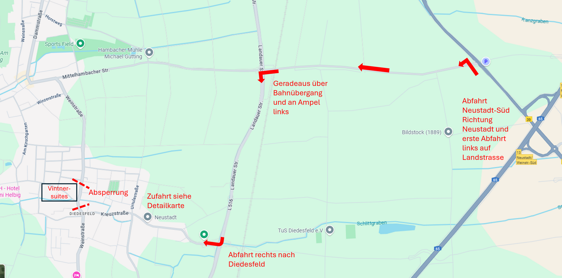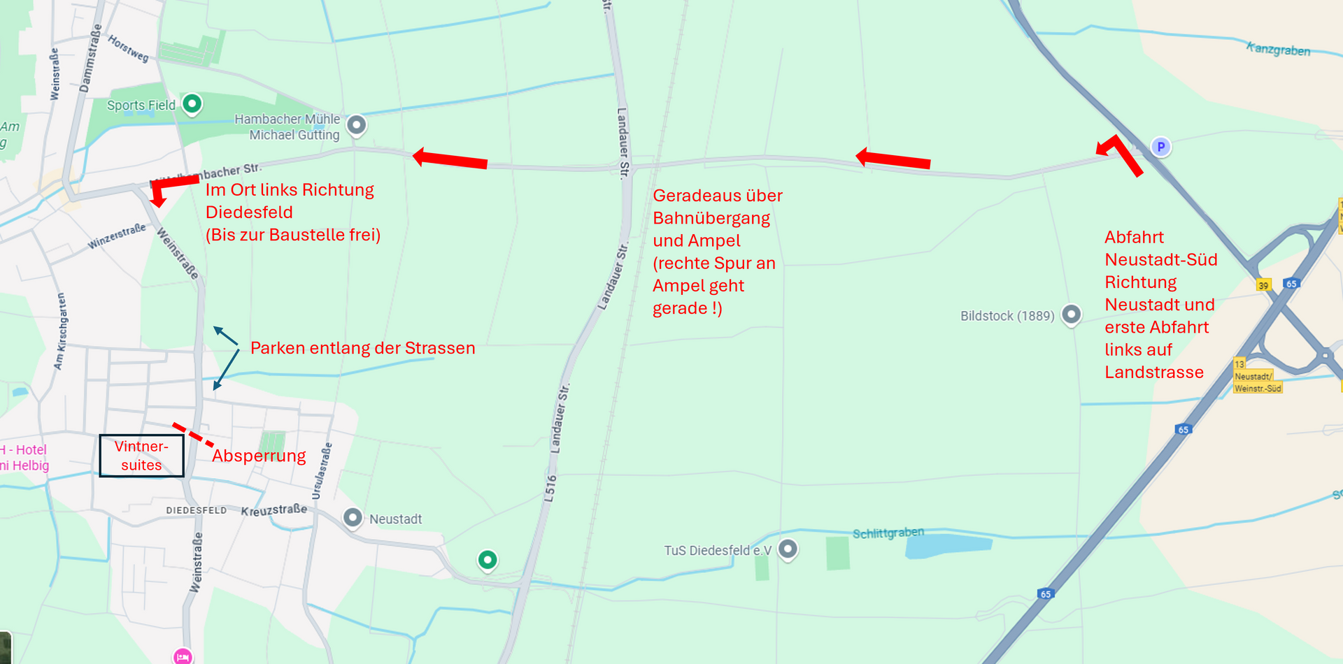 Bei Anfahrt über Maikammer bzw. die Weinstrasse einfach der Weinstrasse folgen. Diese macht eine durch die Baustelle erzwungene Rechtskurve im Dorf bei der Konditorei und geht dort in die Kreuzstrasse über. Analog zuobiger Beschreibung dann links in die Remigiusstrasse abbiegen.