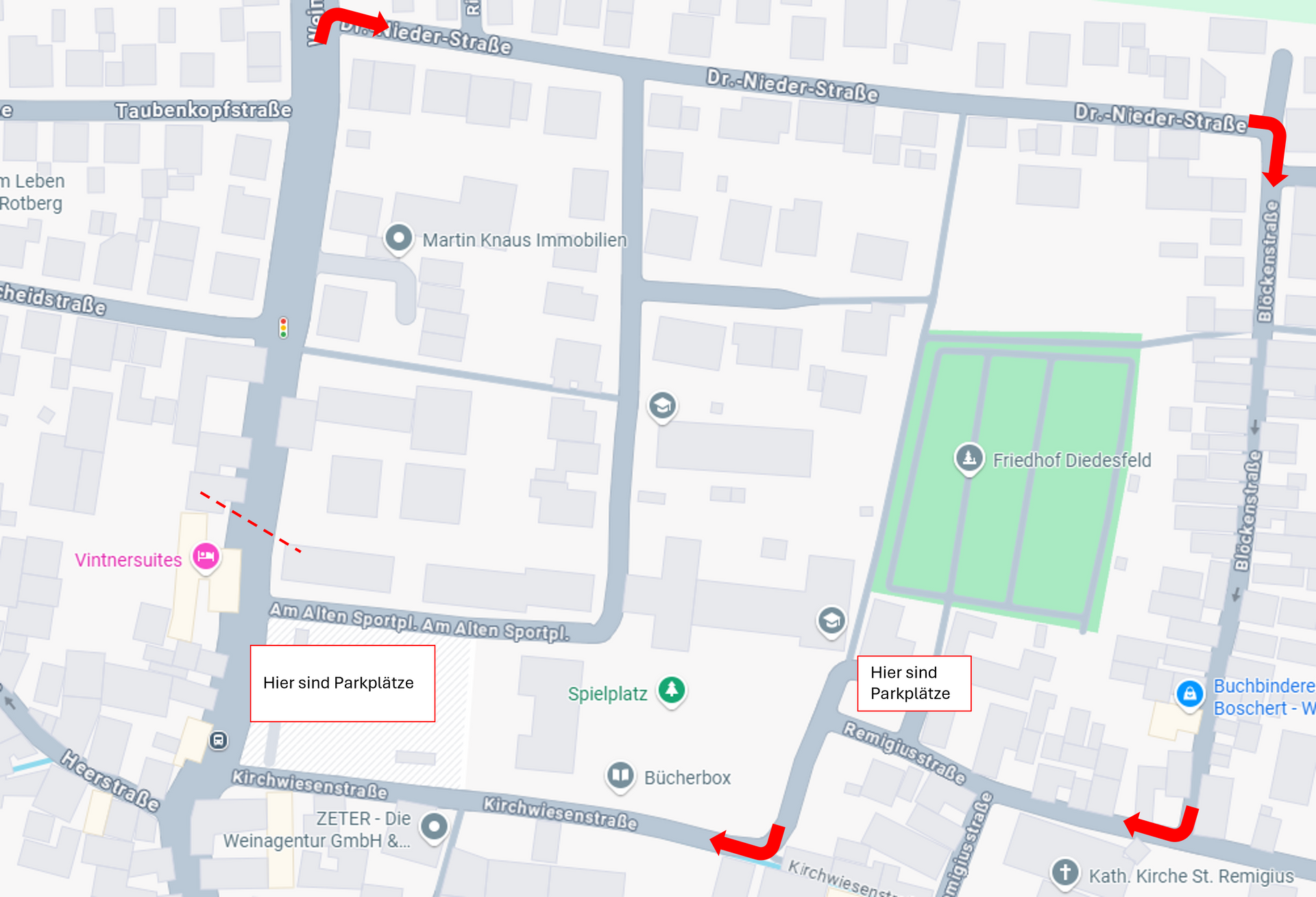 Alternativ (s. Detailkarte unten) über die Dr. Nieder-Strasse und Blöckenstrasse in die Remigiusstrasse. An derem Ende (Achtung, recht teilweise schmal) sind Parkplätze.